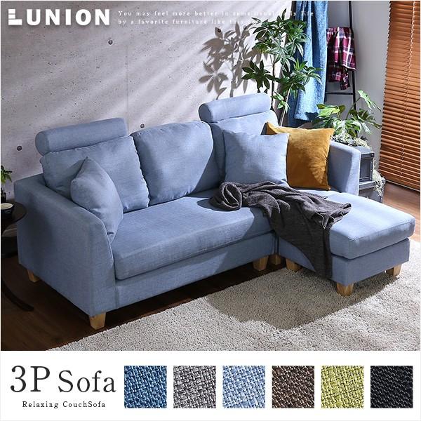 3人掛けカウチソファ 布地 6色展開 ヘッドレスト クッション各2個付