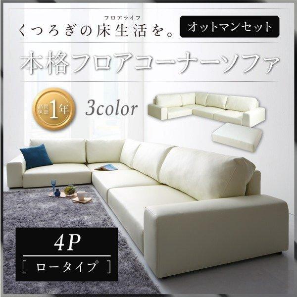 ローソファー 4人掛け 合皮レザー 4p ロータイプ オットマンセット