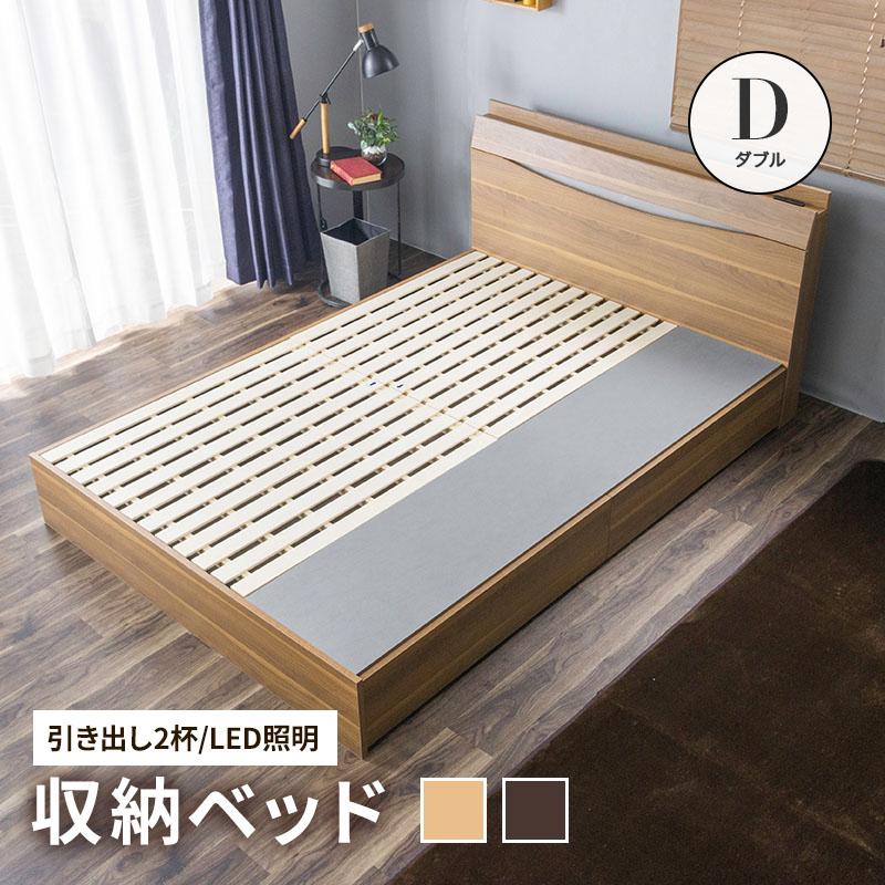 引き出し2杯チェスト収納ベッド ダブルベッド Ledライト付き 棚