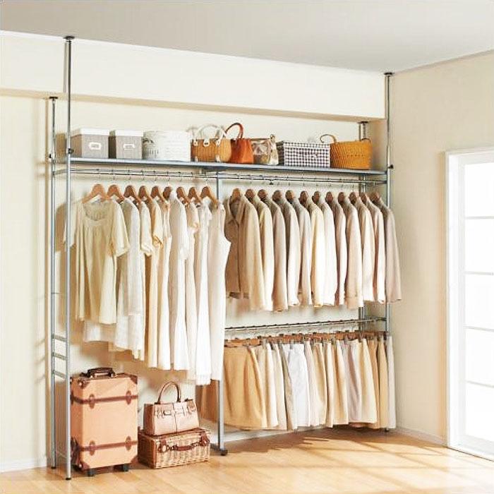ハンガーラック 突っ張り ラック 壁面 収納 2段 頑丈 収納 棚 つっぱり 伸縮式 天井 洋服 収納 衣類 衣装 ウォークイン