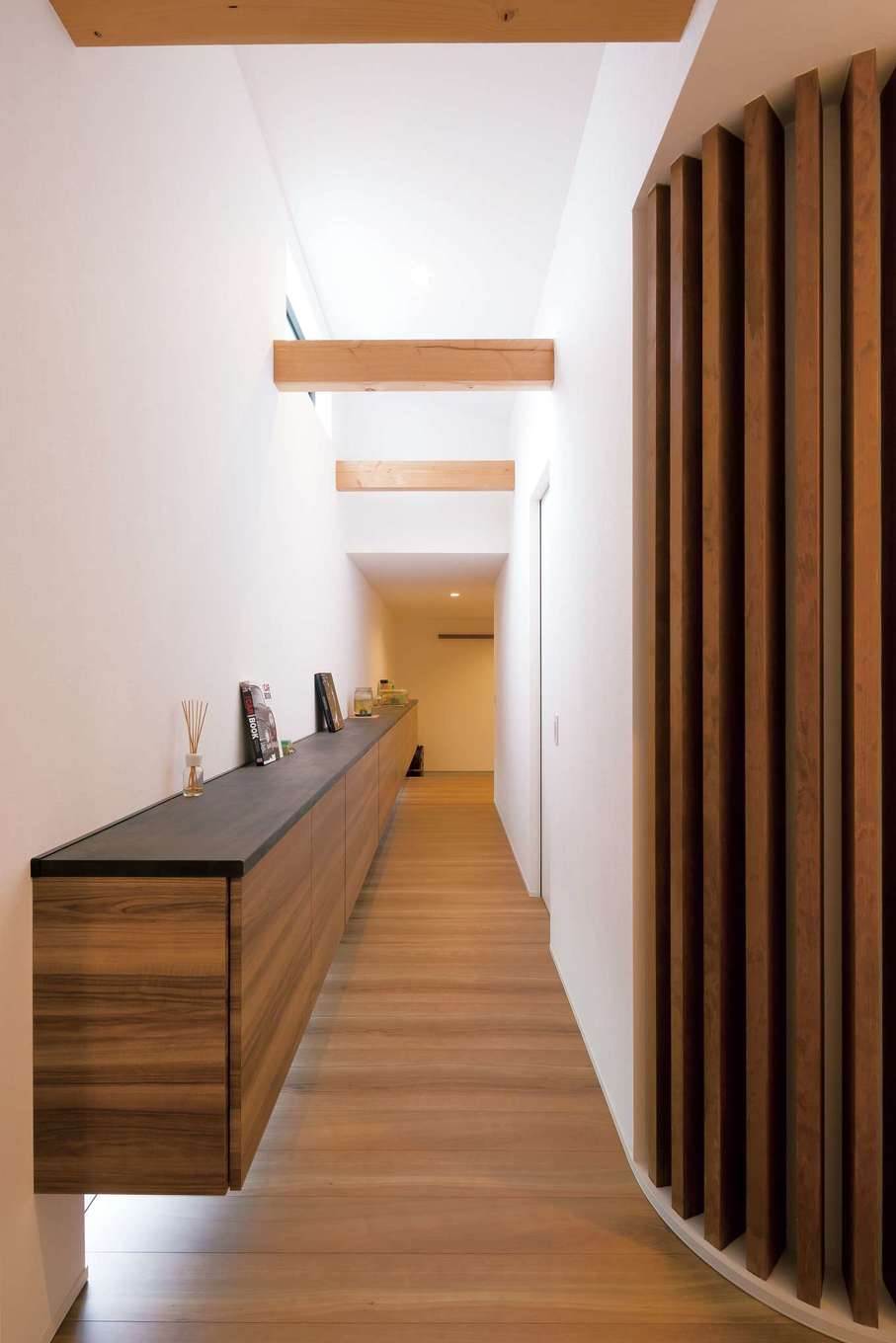 玄関からリビングへつながる廊下 宙に浮かぶように長い収納棚を造作し