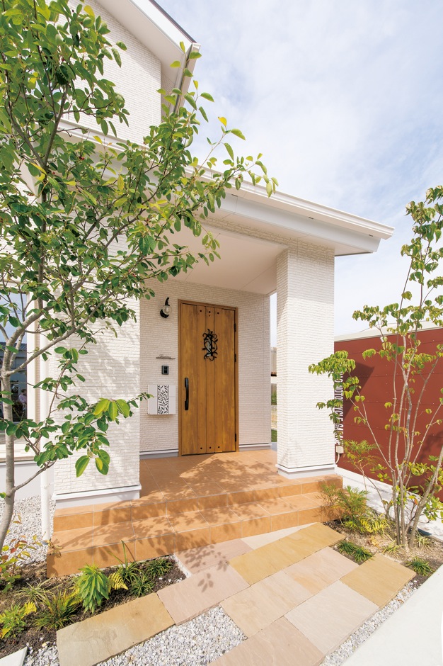 白い外壁にシンボルツリーの緑が映えるオシャレな玄関ポーチ イエタテ