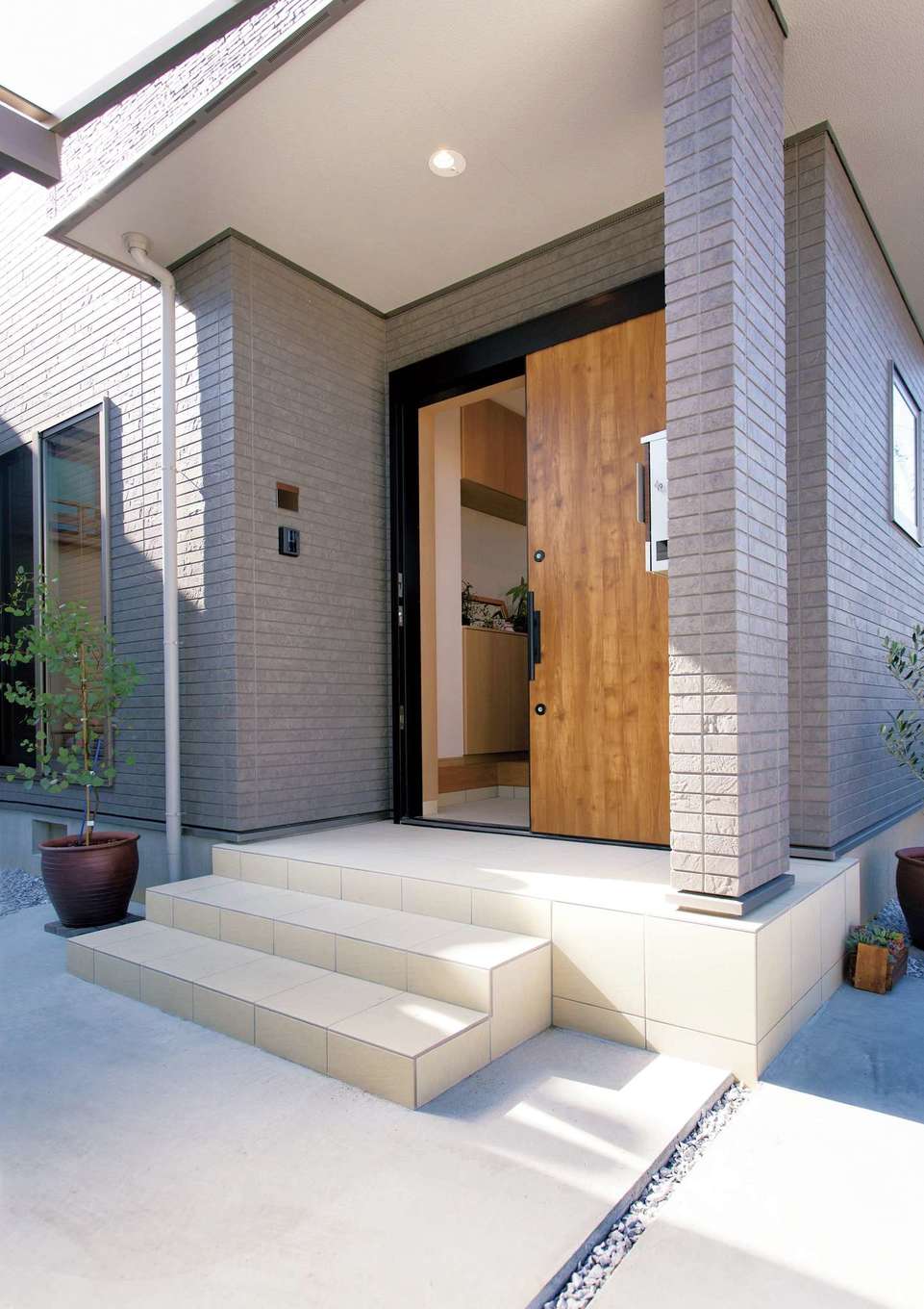 シックな外壁に 木製のドアが映える玄関ポーチ イエタテ