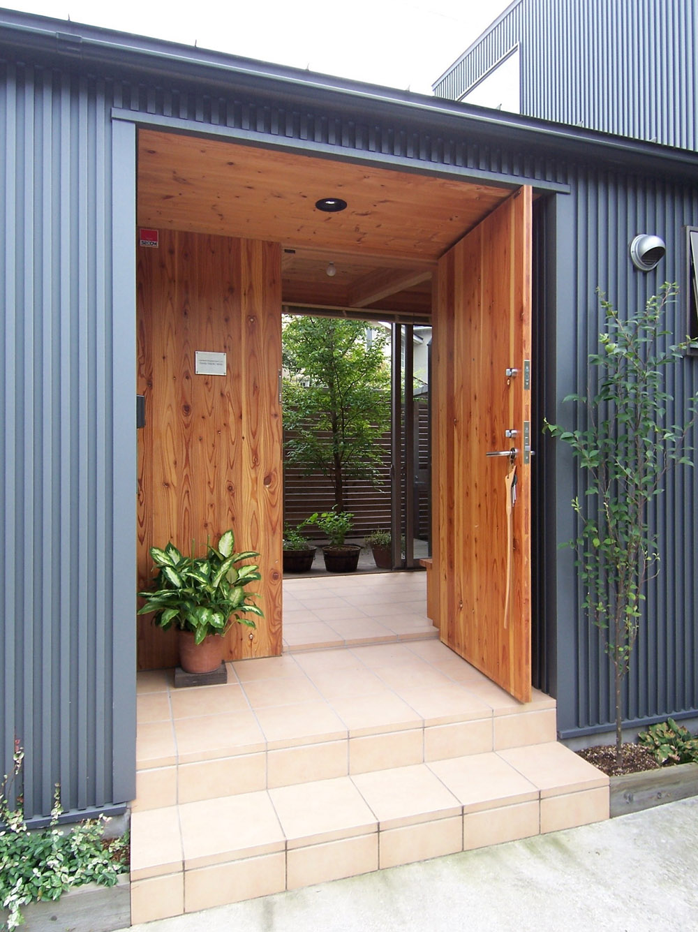 木の外壁で囲まれた玄関ポーチ ロフトでつながる大屋根の家 玄関