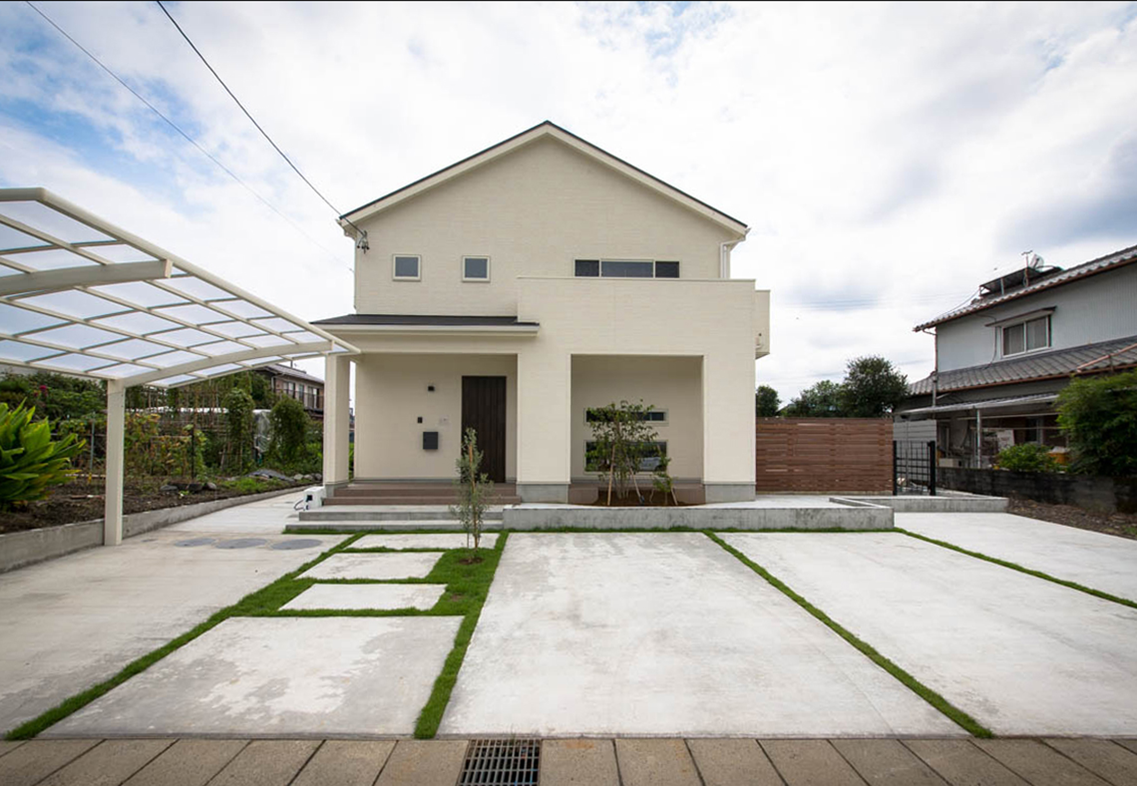 家 外観 エクステリア 切妻屋根 白い家 塗り壁 無垢玄関ドア