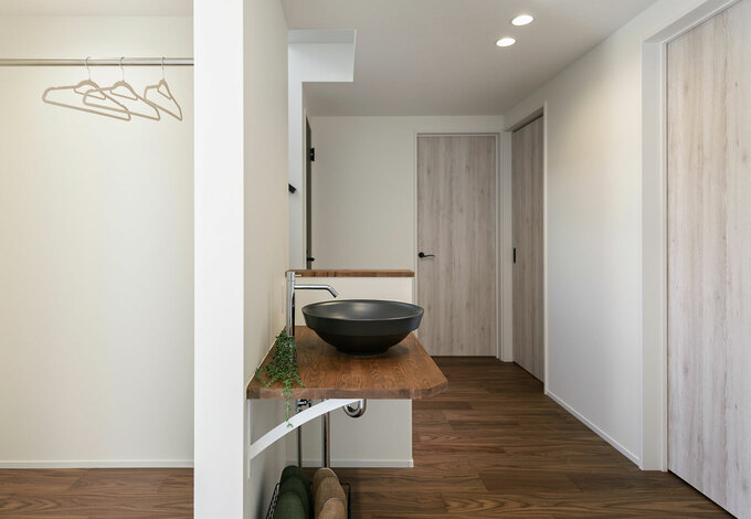 玄関には コートを掛けるハンガーラックと 帰宅してすぐに手を洗う
