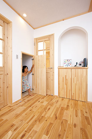 アーチがかわいいニッチは 下部を扉付きの収納に 雑貨を飾ったり