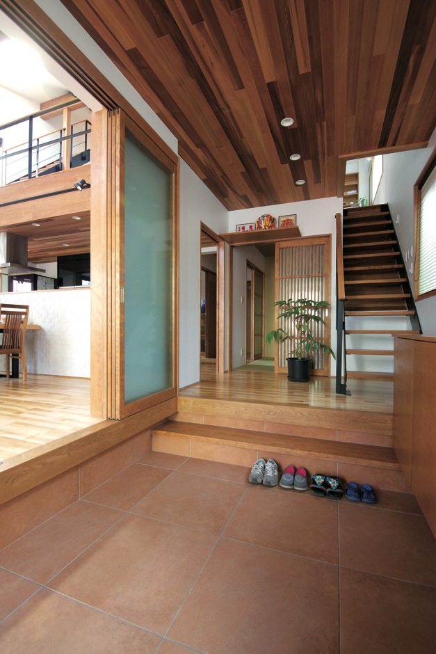 玄関の天井はレッドシダー張り 土間スペースを広く取り リビングにも