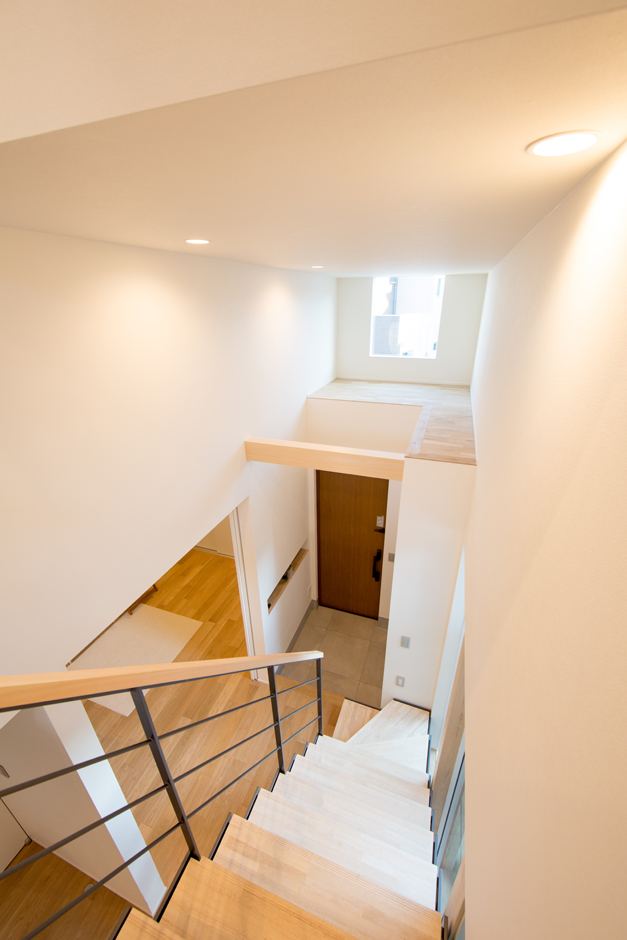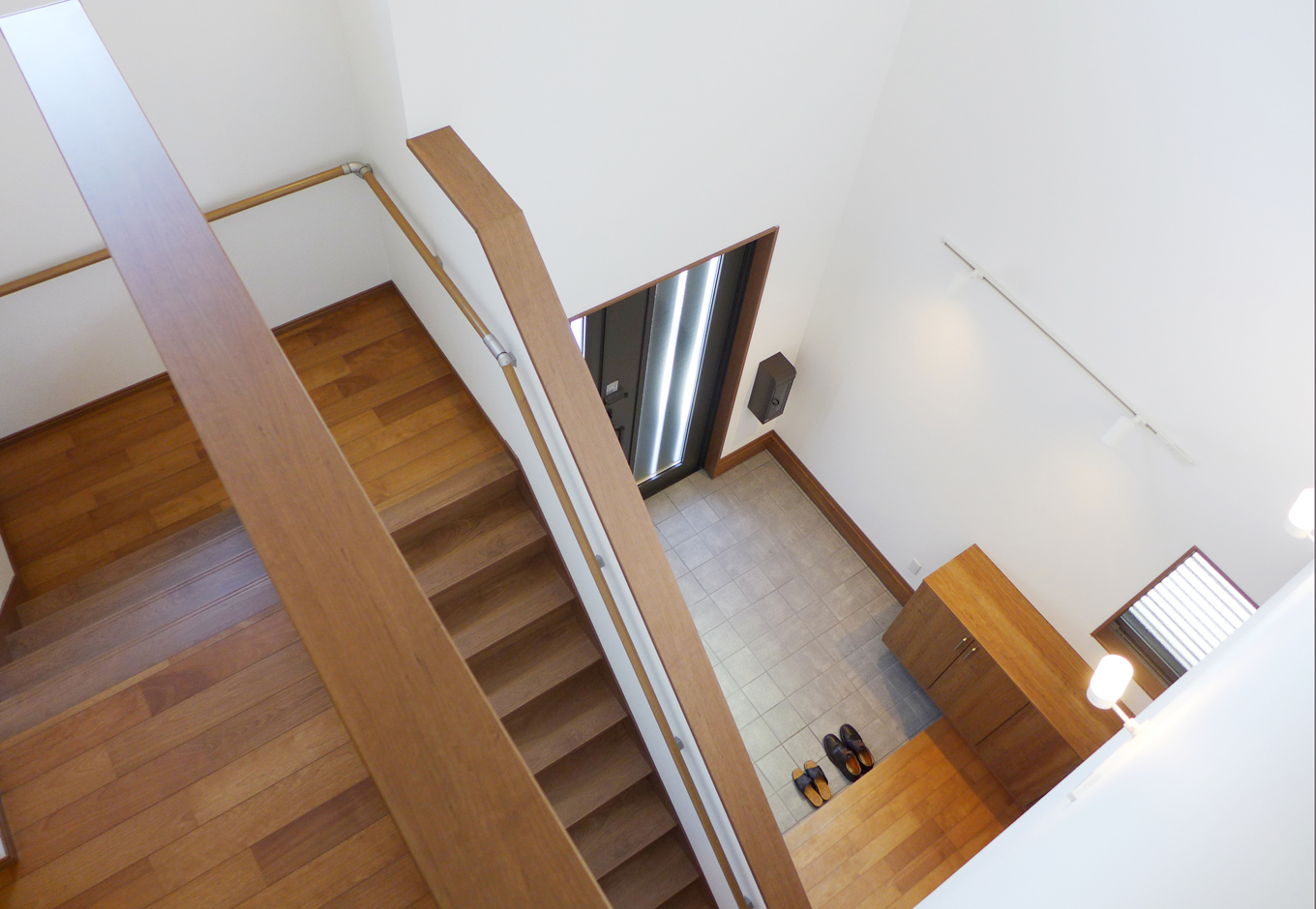 玄関から階段にかけて 吹き抜けのような空間を設けた 玄関上部には