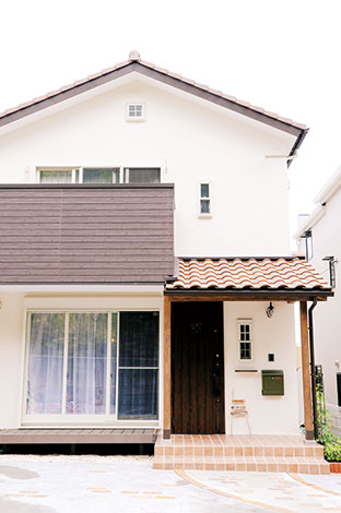 漆喰の白壁に 洋風瓦と玄関のタイルの色がよく映える 表札もアイアンで一工夫 イエタテ