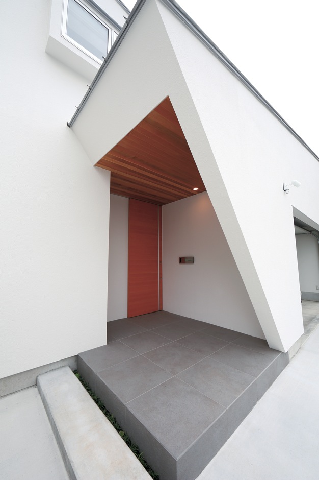 ほぼ真四角の外観に変化をもたらしたのは 斜めに切りこんだ玄関