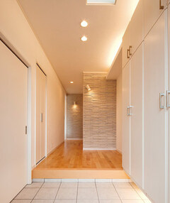 玄関正面にタイル 壁を採用 照明に よる陰影が高級感 を醸し出す