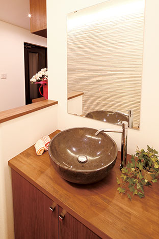 玄関ホール内に設けたおしゃれな洗面台 大理石のボウルは 奥さまが