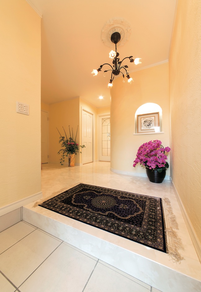 大理石調の床と珪藻土の塗り壁を使用した玄関 Rの壁にやさしさを