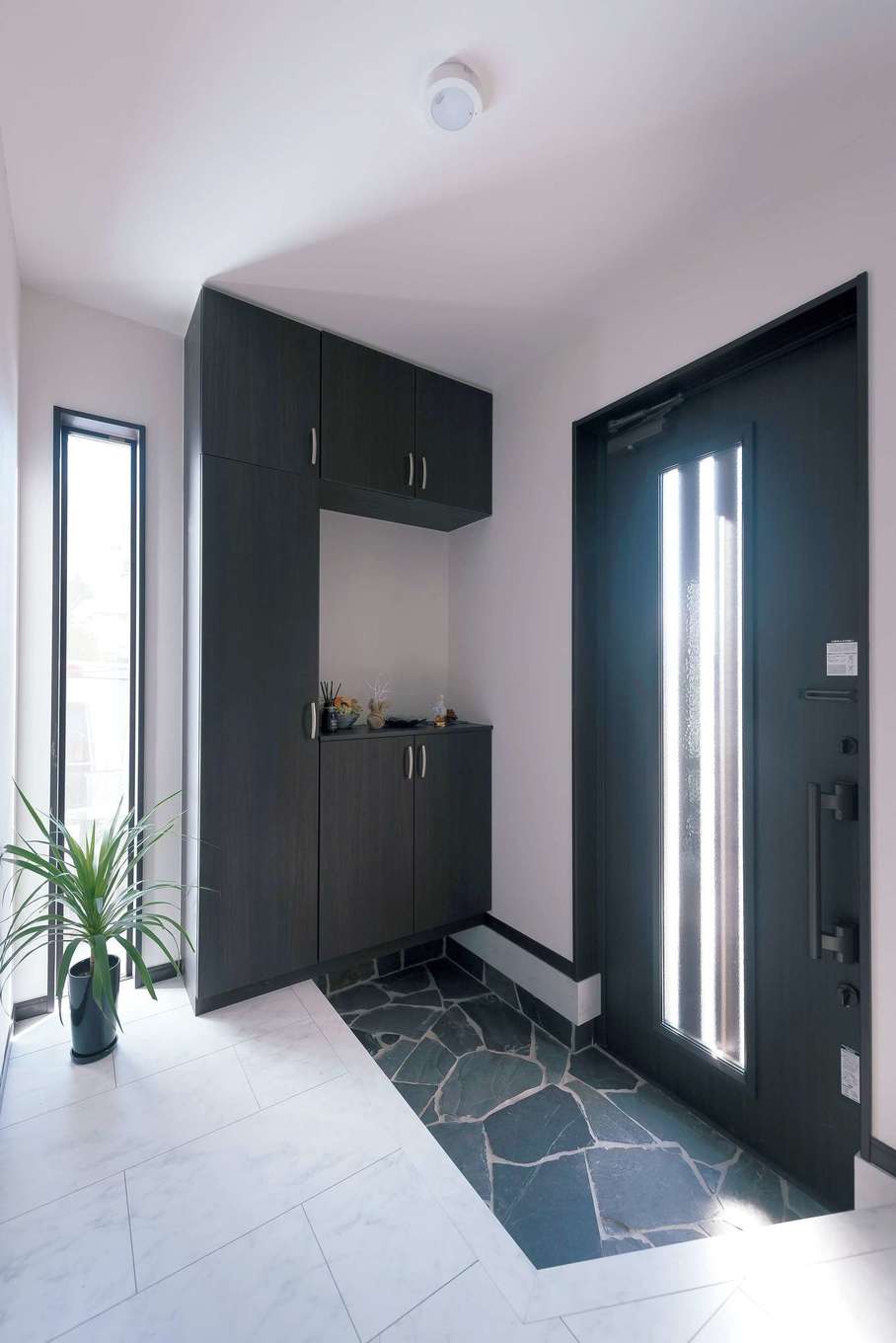 玄関は自然石の乱貼りで高級感のある仕上がりに 採光とデザインを兼ねた縦スリット窓もおしゃれ イエタテ