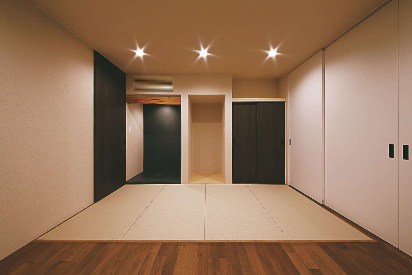 リビングの隣に設けた客間 半分を畳敷きに 半分を板張りにし モダン